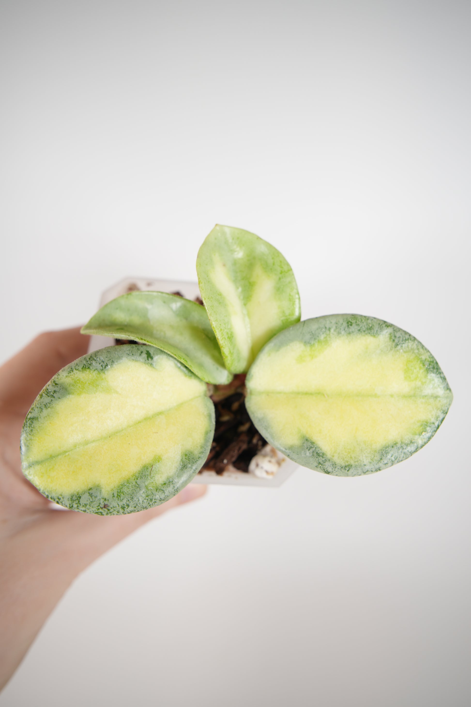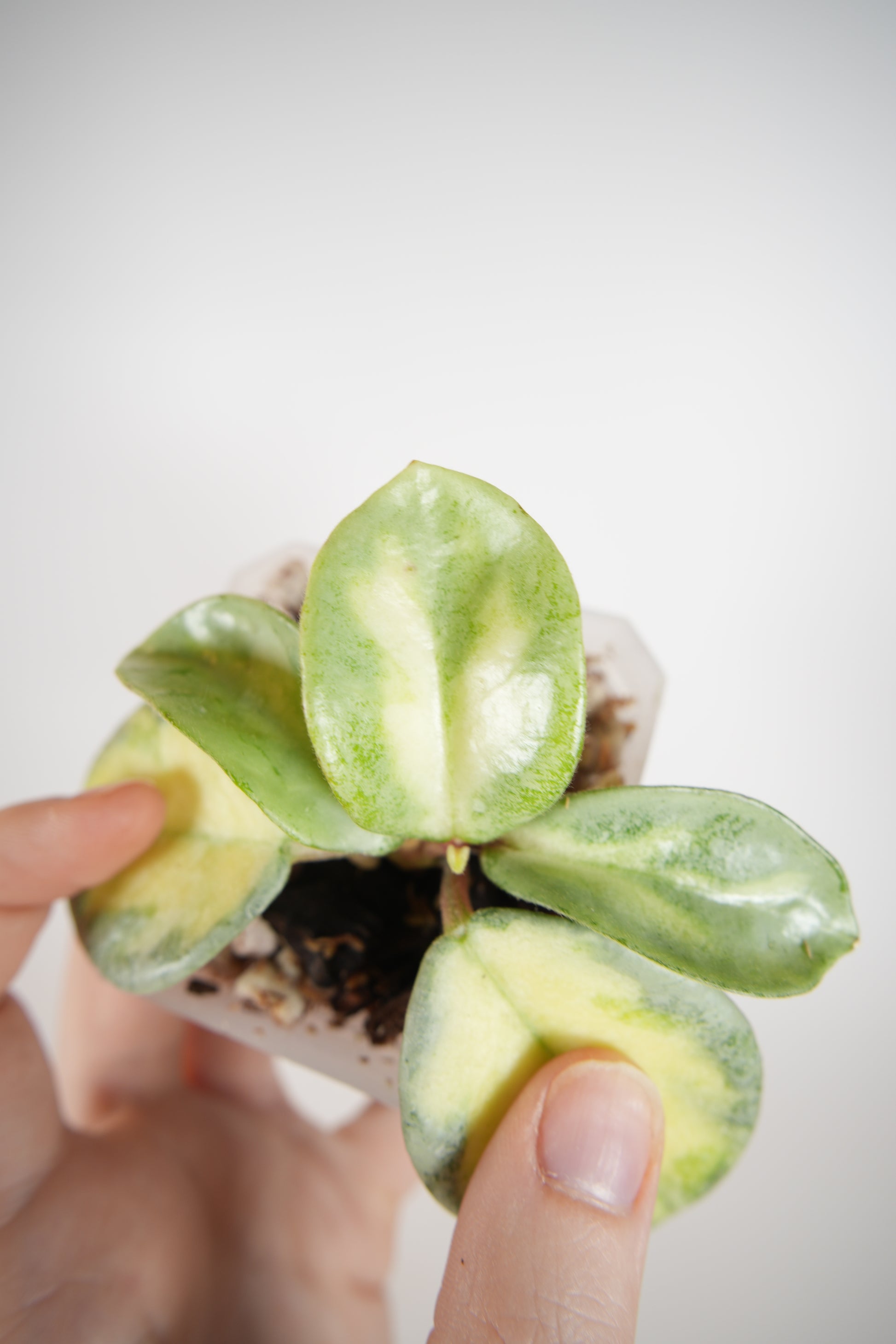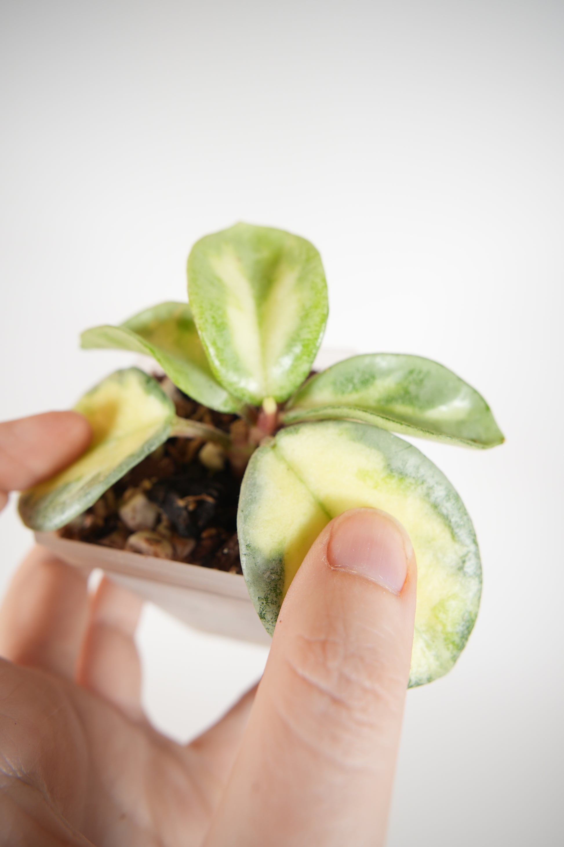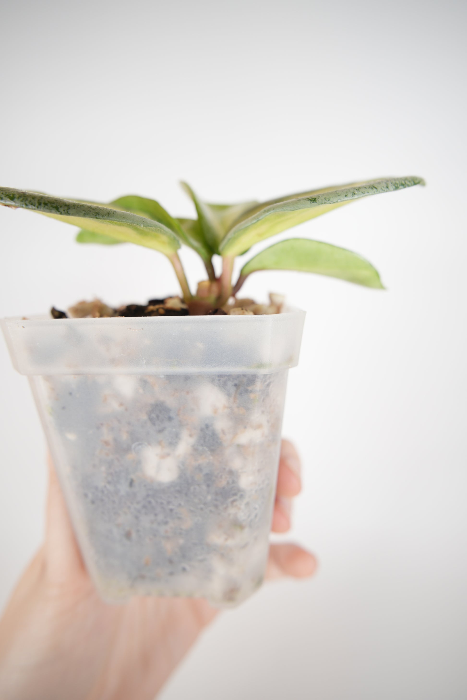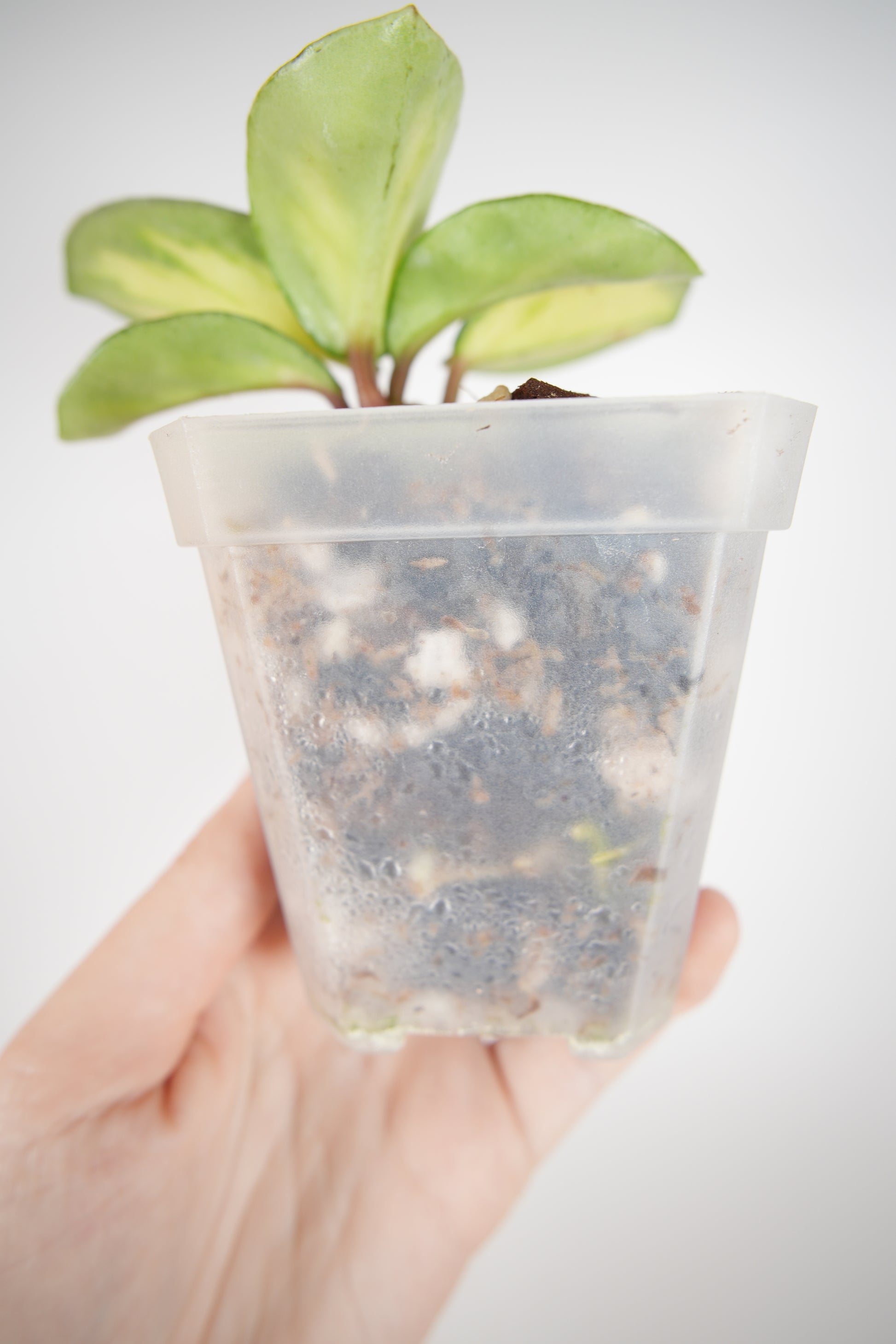 rooted in a 2" clear pot (recently repotted) with new growth.