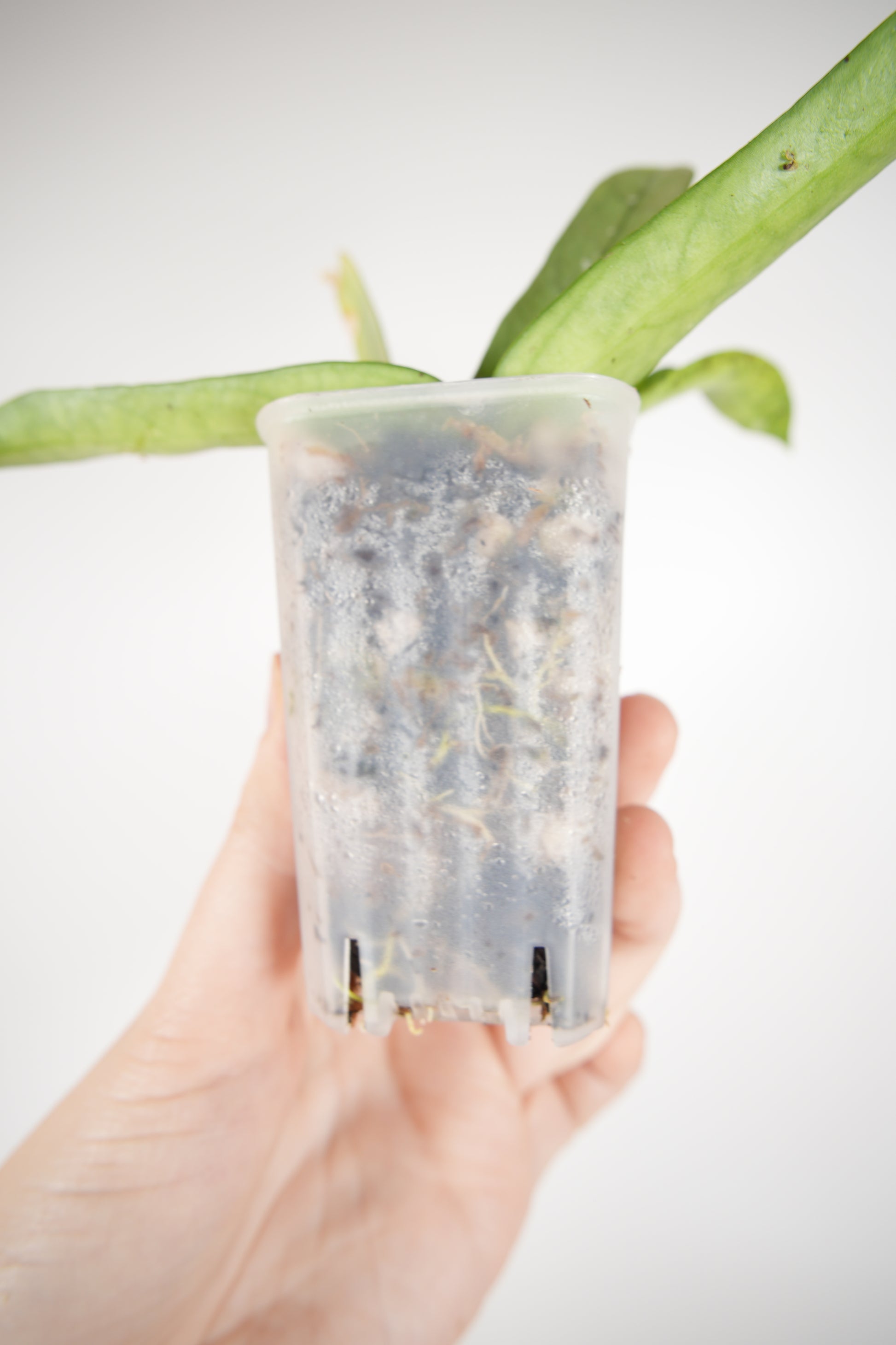 rooted in a 2" clear tall pot (recently repotted) with active growth.
