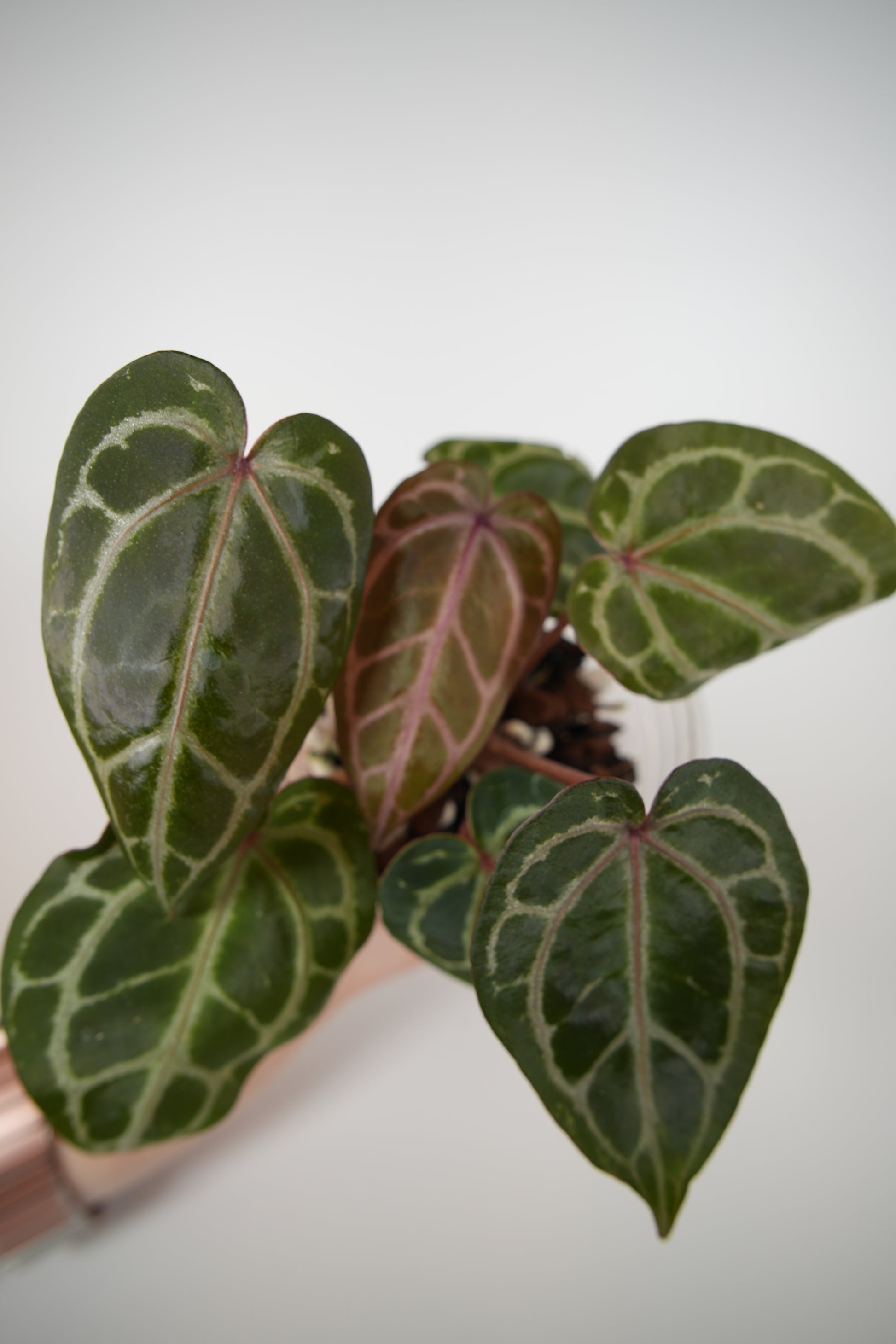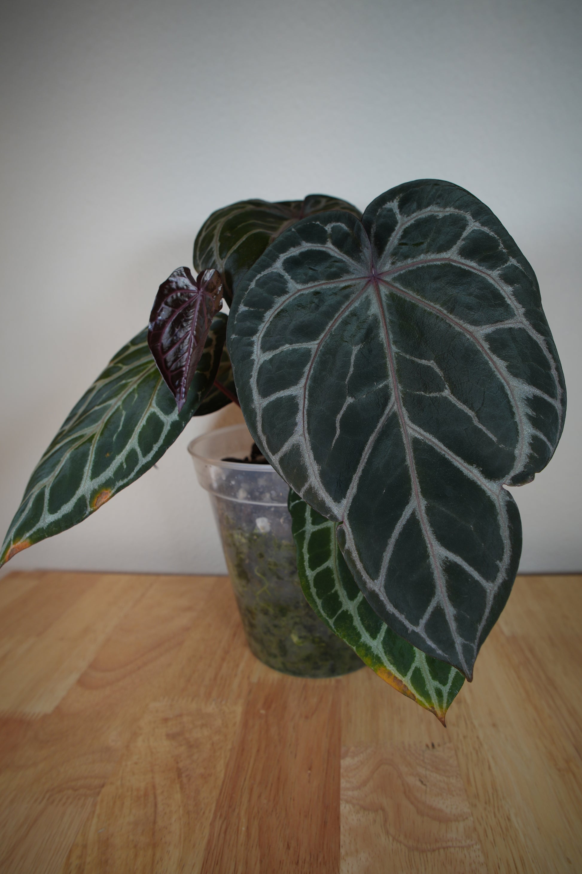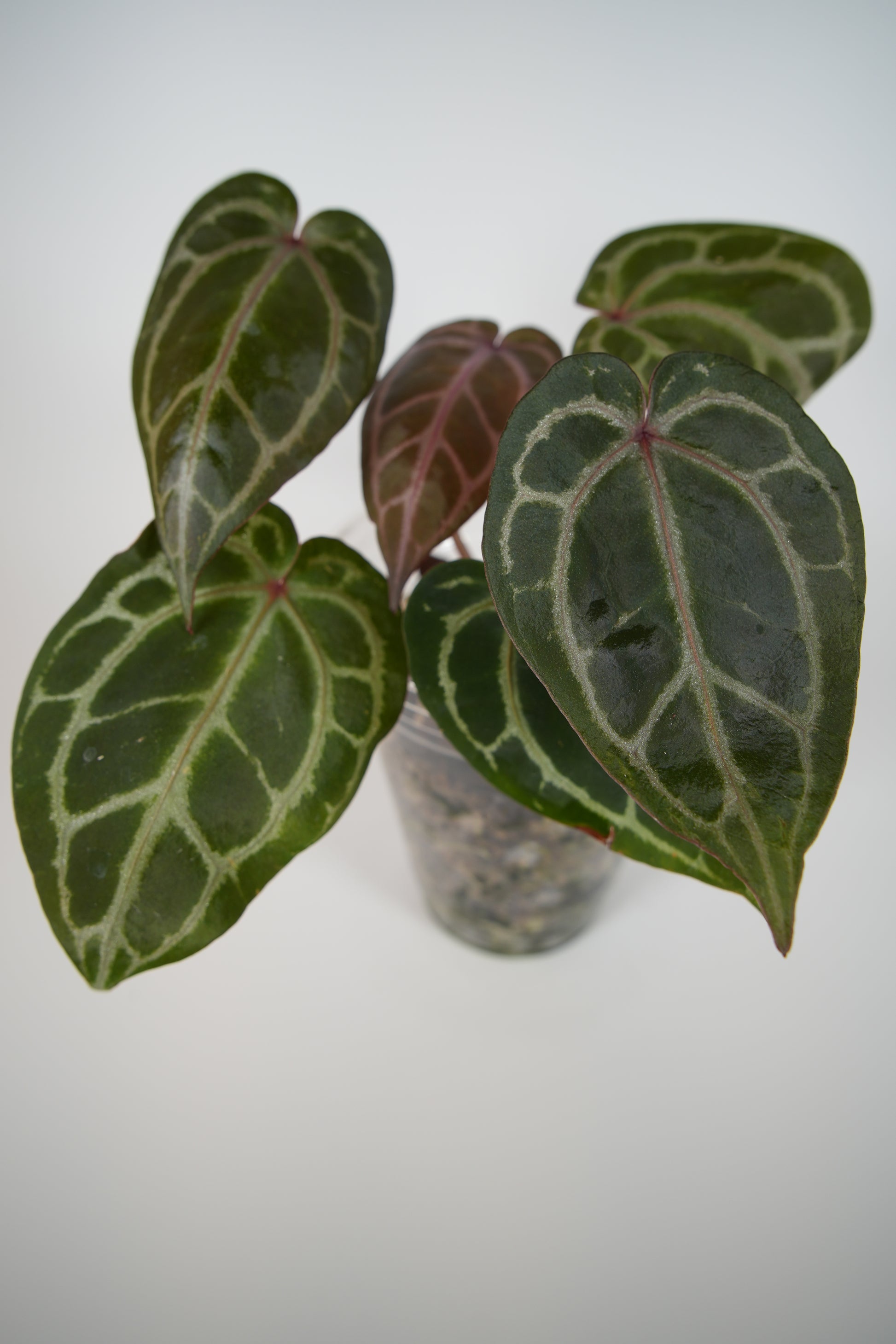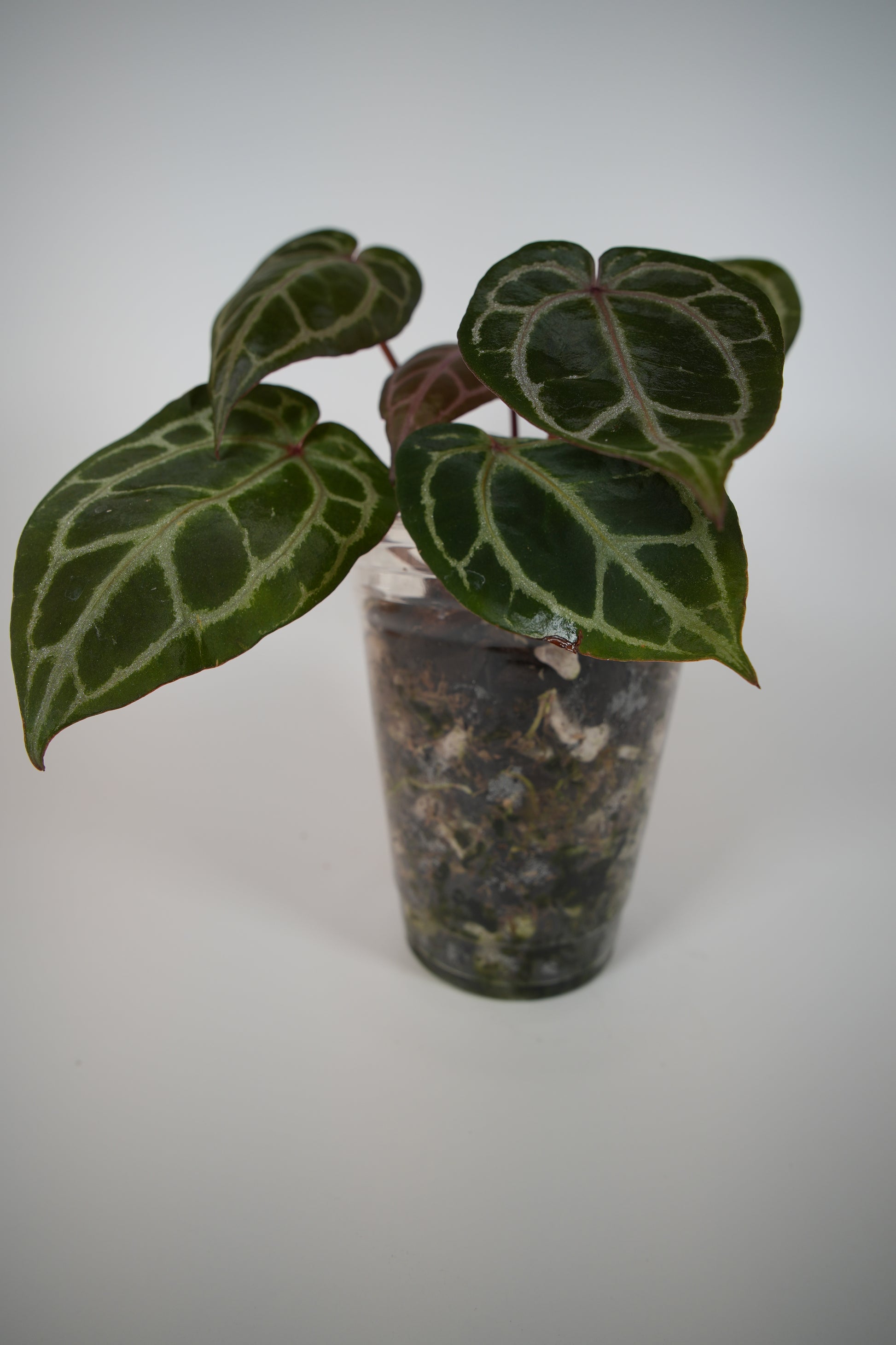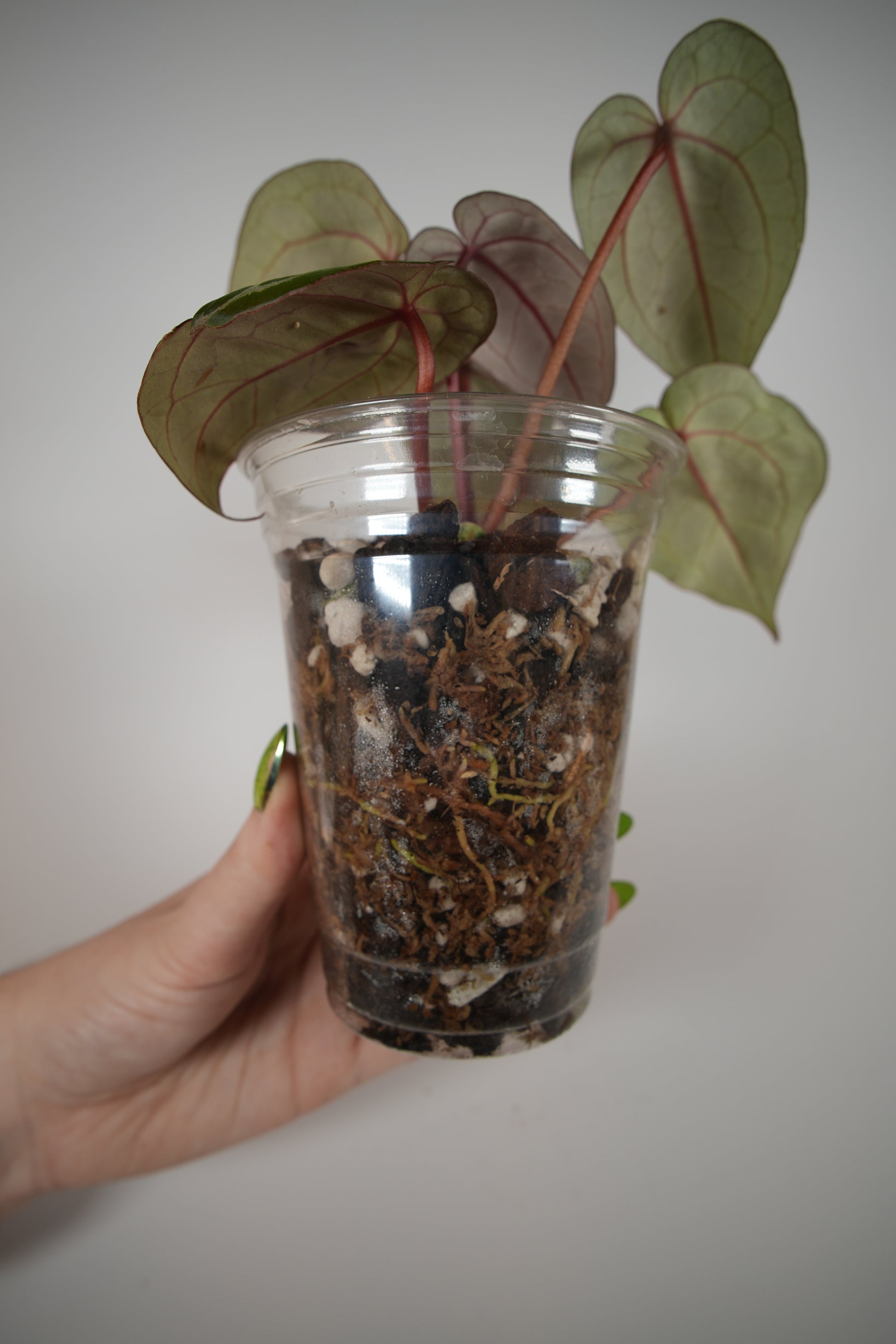 rooted offset in a 2" clear plastic cup with an emergent leaf.